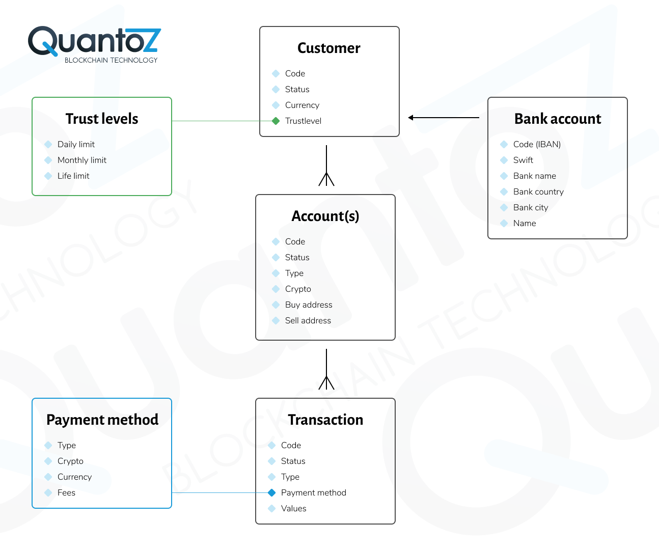 At a first glance of the image below, it is easy to grasp the main fields of the customer entity, namely the unique code, status and trustlevel. Following, a customer has account(s), which consist in whitelisted buy/sell address-pairs of specific cryptos or blockchains that can be used with specific transaction types. Transactions represent customer initiated exchanges between a crypto/token amount and fiat currency amount.